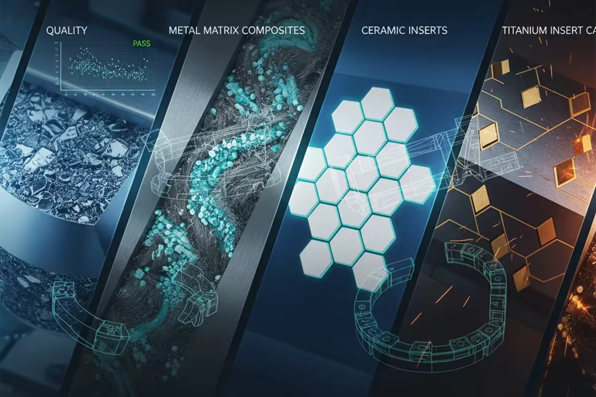 Metal Matrix Composites (MMC) and Titanium Carbide (TiC) inserts represent the two most significant advances in crusher wear technology. MMC embeds ceramic phases in a metallic matrix for 2-4× wear life improvement in abrasion-dominant applications. TiC inserts reinforce manganese steel edges for 40-60% longer service while maintaining impact toughness. Selection depends on duty class, shock environment, and contamination risk.